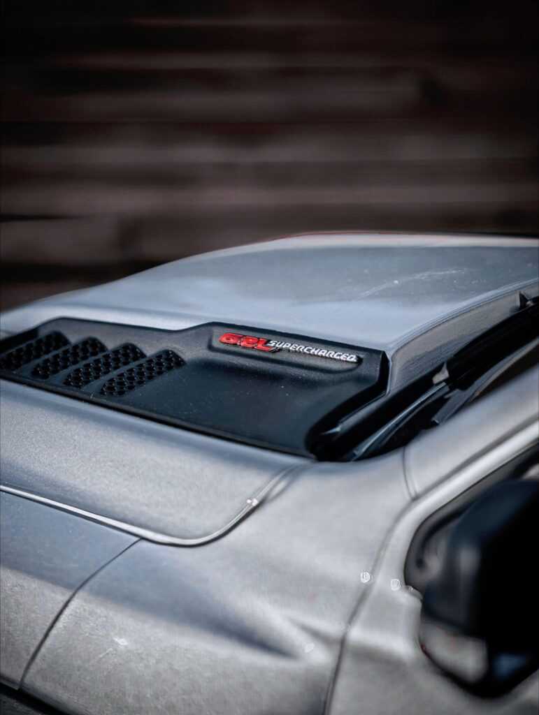 The air filter intake and metal exhaust pipe assembly bring mechanical realism to both the engine bay and the rear section.