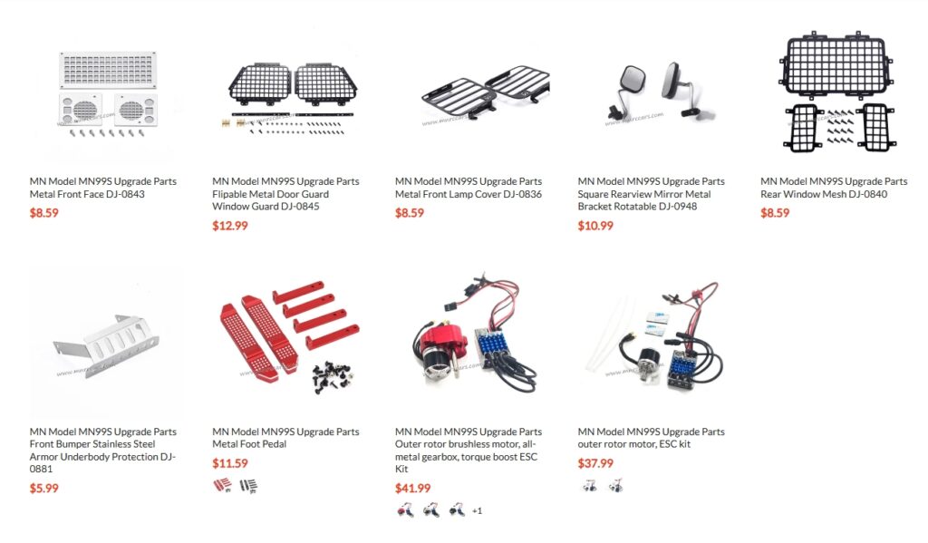 This collection of metal upgrade parts transforms your MN99S from a “standard version” into a full-metal off-road beast!
